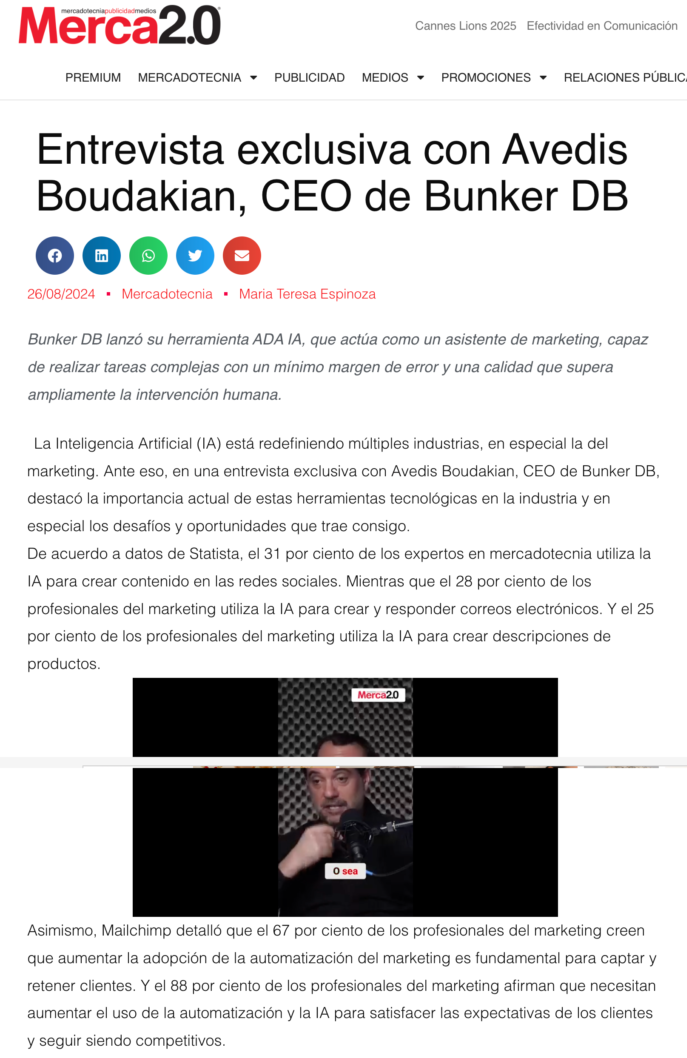 Bunker DB es una empresa de martech especializada en ayudar a los departamentos de marketing y agencias a mejorar su eficiencia mediante el análisis de datos y la automatización de procesos operativos utilizando IA. Con ocho años de experiencia y nueve oficinas comerciales, Bunker DB se ha convertido en una de las plataformas líderes en análisis omnicanal en la región. Su tecnología propietaria está siendo utilizada en más de 20 países por más de 1200 marcas de primera categoría, como Walmart, Nestlé, L’Oréal, Scotiabank, KFC, Glaxo, Samsung, Pepsico, Tigo, Telefónica, Liberty, Coca Cola, Itaú. Visita bunkerdb.com.